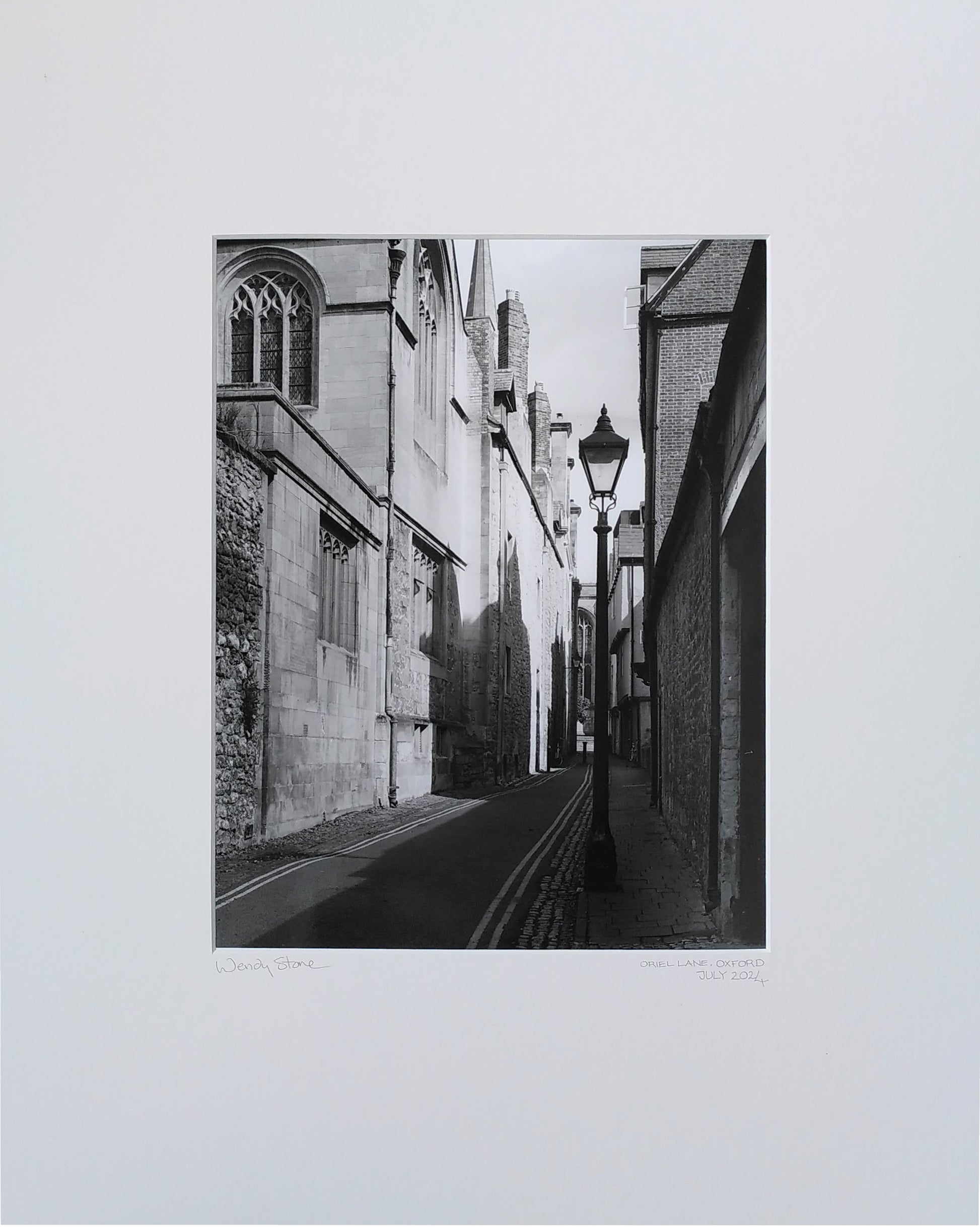 This is a view of one of Wendy's many 'favourite' Oxford streetlamps, on Oriel Street, part of her 'Low Light and Shadows' series capturing Oxford in spring and summer. Taken with her Sanderson ‘Regular’ quarter-plate camera, which is over 120 years old, and developed and printed at Oxford Darkrooms.