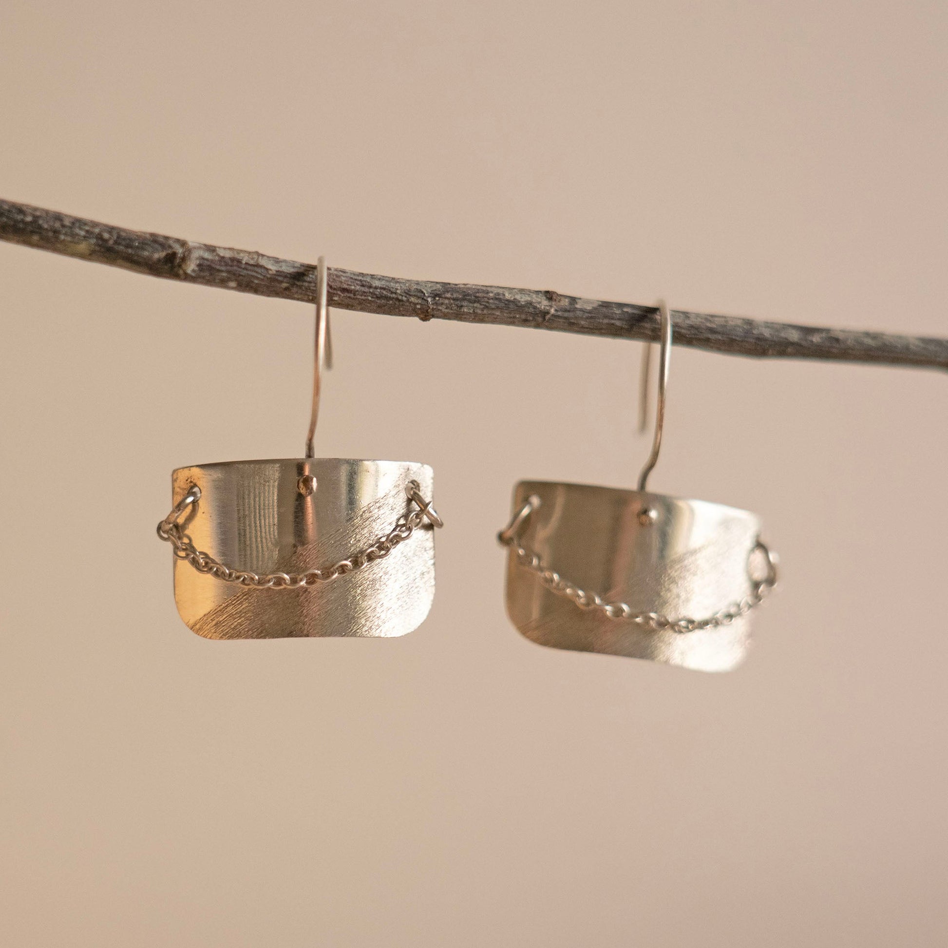 Convex-shaped drop earrings made by Céline Bateman-Paris using 100% recycled 925 sterling silver sheet, wire and 925 sterling silver chain.