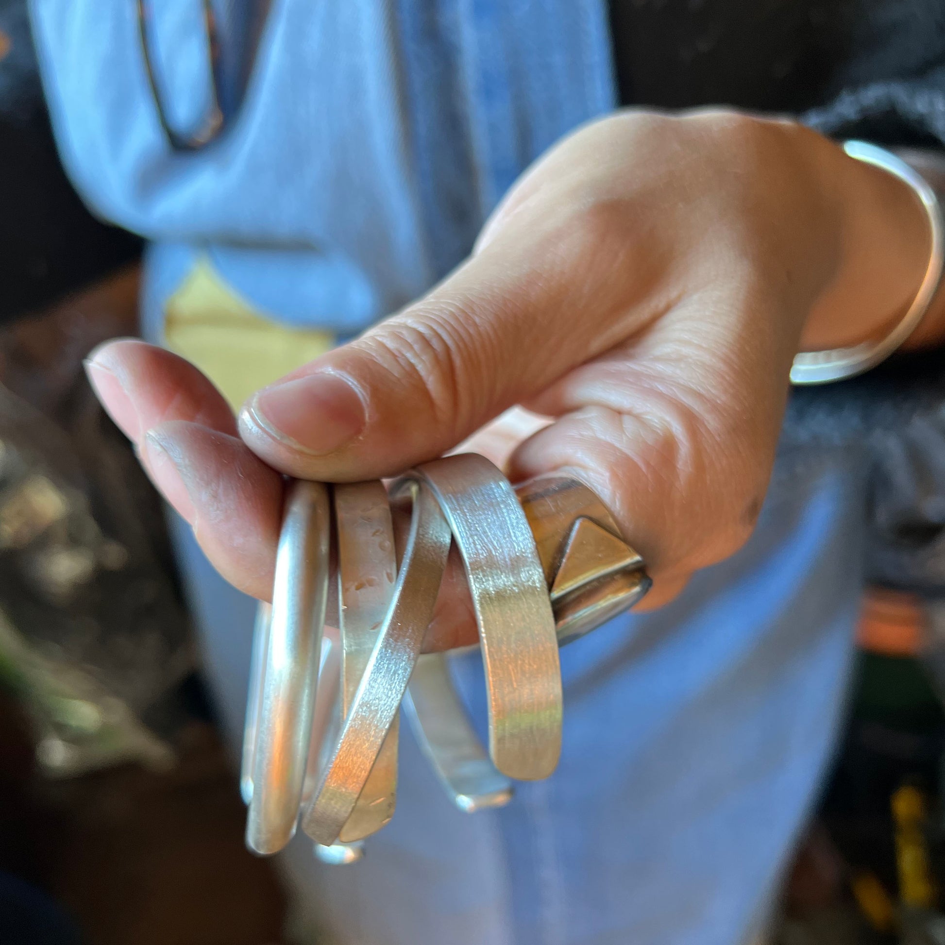 A timeless bangle made by Céline Bateman-Paris in her home studio in Oxford, using 100% recycled 925 sterling silver. Brushed finish on the outside and polished finish on the inside. Asymmetrical ends.