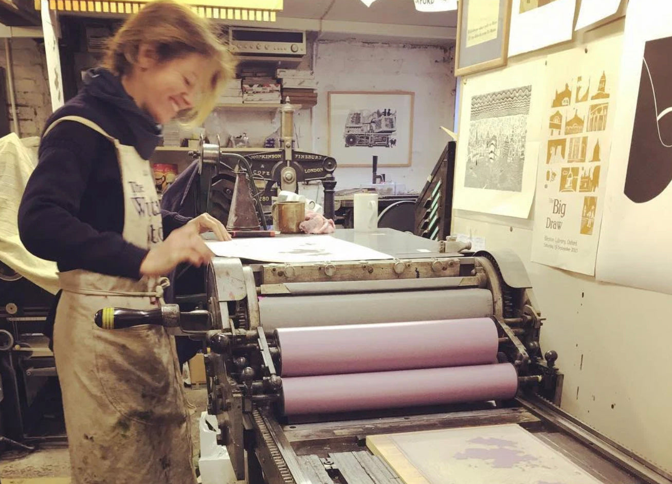 A Wytham Woods poster printed with a linocut image on four blocks and letterpress type.